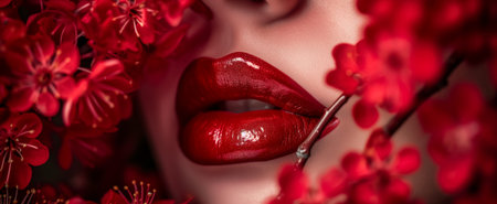 Detailed close-up of glossy red lips and vibrant red blossoms in a sensual setting