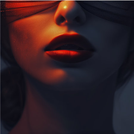A close-up of a woman's face, with a focus on her red lips, set against a cool, teal backdrop. The woman's eyes are obscured by a piece of fabric, creating a sense of mystery and intrigue. The image captures a moment of intimacy and sensuality, highlighting the power of subtle details.