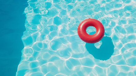 Bright red inflatable pool ring floating in inviting blue swimming pool on a sunny day