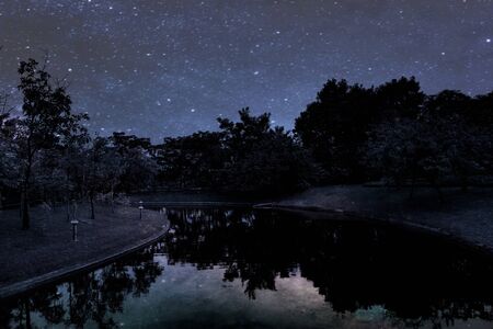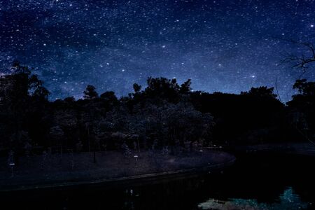 Beautiful abstract texture colorful black and white flowers and tree plant forest landscape on the darkness and aurora Polaris and the stars on the sky milky way galaxy background and wallpaper