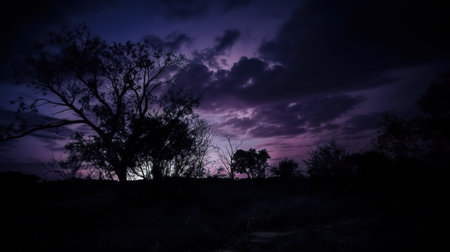 A beautiful dark tree silhouettes against the dark blue skies in dawn. Springtime scenery before the sunrise. Dark skyscape in spring in Northern Europe.