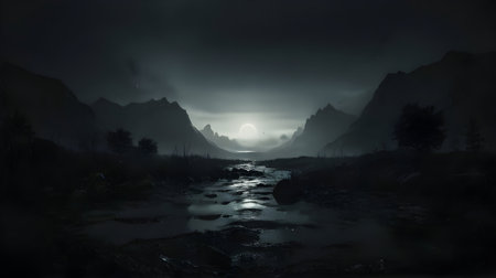 a misty gothic forest area with a stream and trees, featuring dark emerald and gray tones. this 8k resolution photo showcases intricate landscapes and environmental portraiture, capturing the beauty of mountainous vistas. the soft, atmospheric lighting adds depth and allure to this captivating scene. ai generated