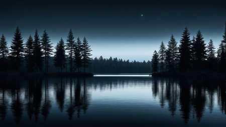 A serene lake with a moon reflecting on the water. Concept of calm and tranquility