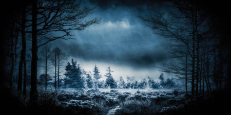 Misty landscape with a fir forest in a hipster vintage retro style. Ideal for adding a nostalgic, atmospheric touch to your designs, perfect for print, digital projects, and aesthetic visual content.