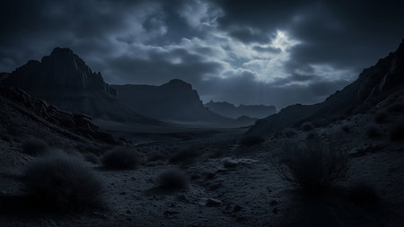 A dark and moody desert canyon landscape at night, with dramatic clouds obscuring the faint moonlight and casting shadows.