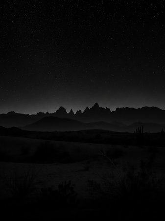 A stark black and white desert landscape at night, featuring silhouetted mountain ranges against a sky filled with countless stars.