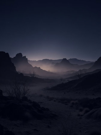 A dark and atmospheric mountain valley at dusk, filled with mist, featuring silhouetted peaks and bare, spindly trees.
