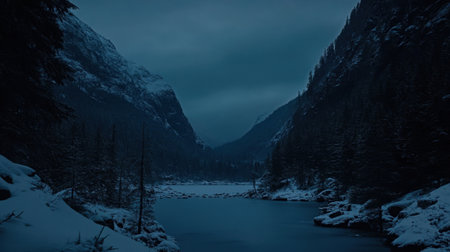 This captivating winter landscape features a tranquil river surrounded by snow-covered mountains and pine trees, exuding a serene atmosphere as dusk settles in.