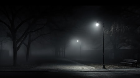 A captivating scene of a deserted road enveloped in thick fog at night, featuring a striking solitary tree silhouetted against a hauntingly illuminated backdrop.