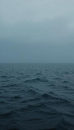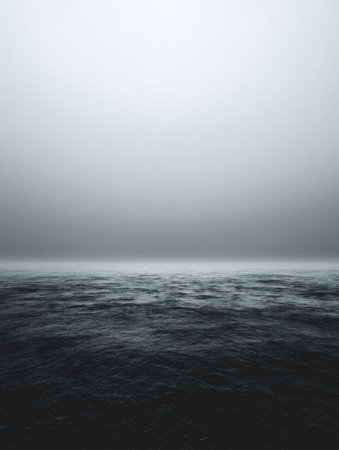 Gentle ocean waves lap against the shore at dawn, surrounded by a blanket of mist and soft, diffused light illuminating the waters surface.