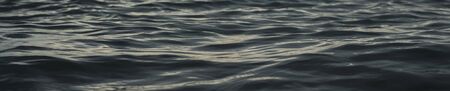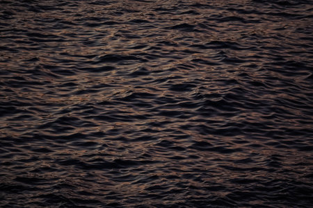 A close-up shot reveals the dark, textured surface of water at dusk. Gentle waves create ripples and reflections, showcasing the water's deep, almost black color.