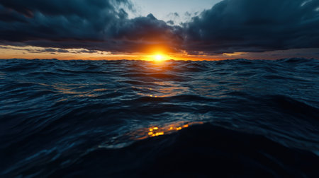 A breathtaking view from the surface of the ocean as the sun sets on the horizon, casting a golden glow on the water and illuminating the dramatic clouds in the sky.