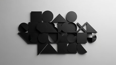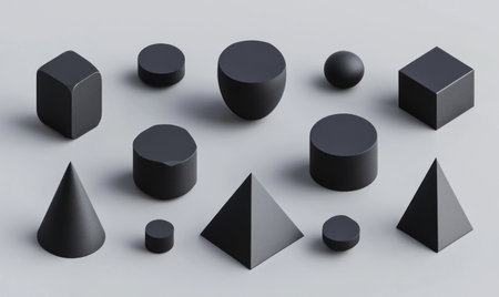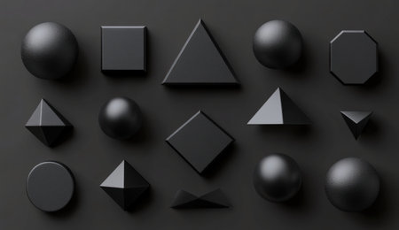 A minimalist composition of matte black geometric shapes like squares circles and triangles arranged on a light gray surface with soft shadows.