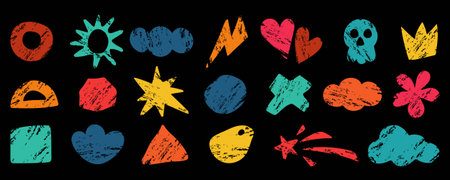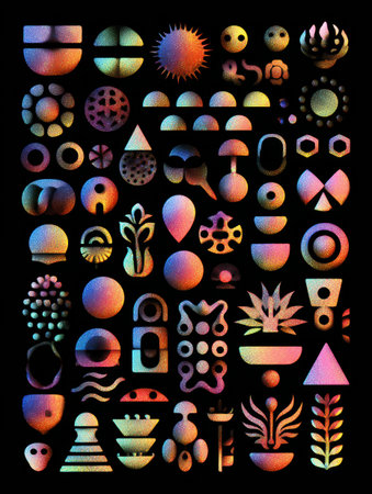 A vibrant grid features an array of abstract shapes and symbols, displaying a lively mix of colors, forms, and textures against a dark backdrop