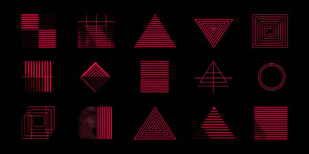 Red lines form distinct geometric shapes on a black backdrop, creating a collection of abstract designs that explore symmetry and patterns.