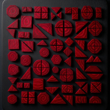 This striking image showcases an array of geometric shapes in various colors arranged on a vibrant red background. Perfect for artistic projects.