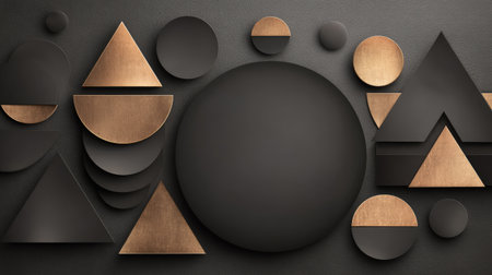 This abstract artwork features a stunning composition of geometric shapes in black and copper, creating a modern and elegant aesthetic. Perfect for design projects.