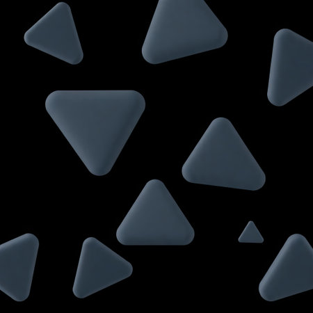 A dark composition features multiple rounded triangle shapes dispersed on a black backdrop. The shapes exhibit a consistent gray color and smooth texture, creating a three-dimensional effect. The arrangement suggests a contemporary design suitable for various visual projects and presentations. This image has potential uses in digital media and advertising.