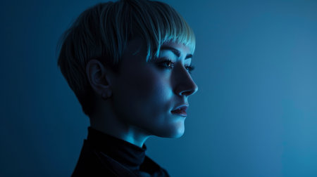 A captivating profile silhouette of a young woman captured in a serene moment, with soft blue lighting creating a tranquil and artistic atmosphere.