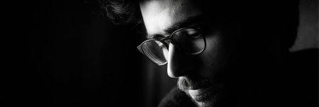 A young man with glasses appears deep in thought, illuminated by soft lighting, creating a serene atmosphere that suggests reflection and introspection.