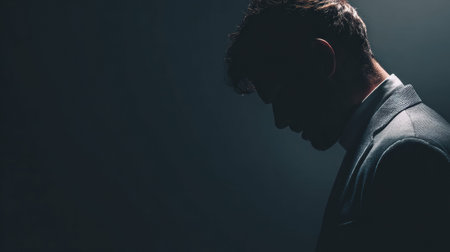 A person shows deep thought and conflict while partially illuminated against a dark backdrop. The setting emphasizes a modern business theme.