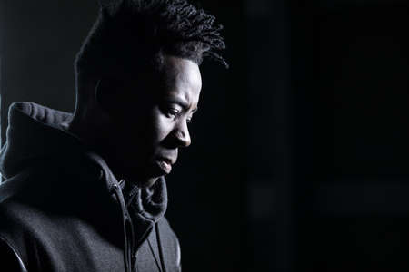 Close-up of young depressed man sitting alone in the darkness