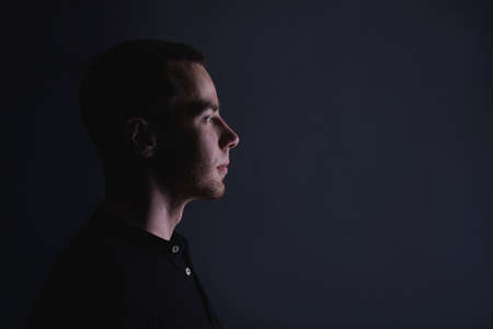 Young man in the dark. male profile portrait on the black background