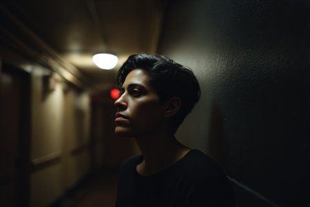 A person leans against a dark wall in a hallway, looking away from the camera. The space is dimly lit with soft lights and appears quiet. The scene takes place at night.