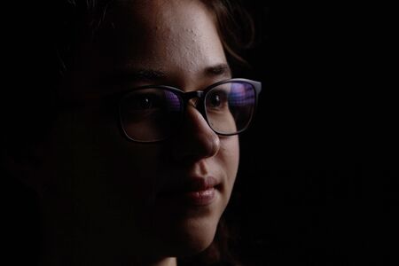 portrait on black with glasses mystery girl.