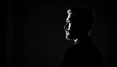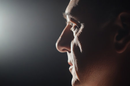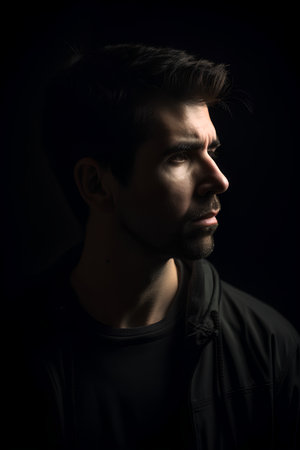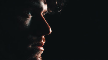 Close-up side profile of a Caucasian man in low-key lighting. Strong contrast highlights facial features, creating a contemplative and dramatic mood.