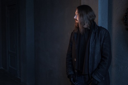 portrait of the young dark-haired man in darkness