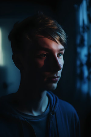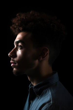 A young man gazes upwards with a thoughtful expression highlighted by contrasting shadows on his face and hair in a minimalist setting.