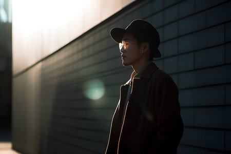 a black man wearing a baseball cap and jacket against a black background