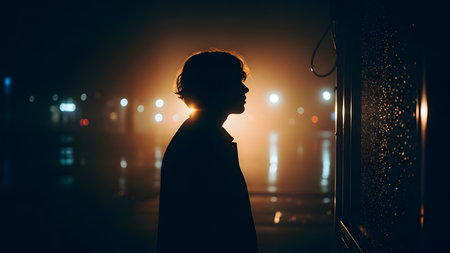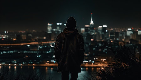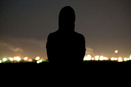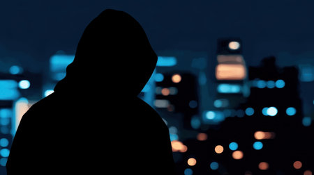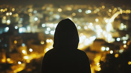 A mysterious silhouette of a figure wearing a hood stands against a blurred city skyline at night, evoking feelings of intrigue and solitude.