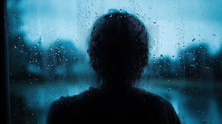 A person stands quietly at a window, their silhouette blurred by raindrops, reflecting a mood of introspection amid the gloomy weather.