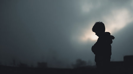 A young person stands still in a dark setting, surrounded by mist and soft light.