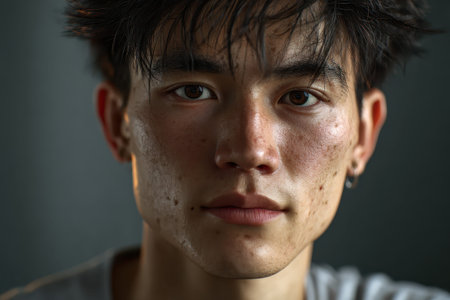 close up image of a young casual man with visible skin problems highlighting blemishes and texture. The photo focuses on the challenges of problematic skin, emphasizing the importance of skin