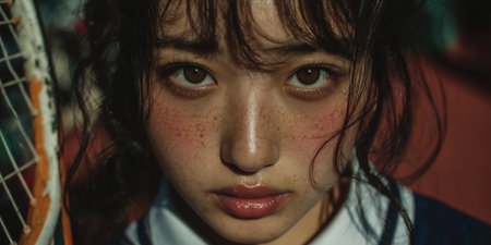 This close-up portrait showcases a young woman's serene expression, highlighting her natural beauty and unique freckles against soft lighting.