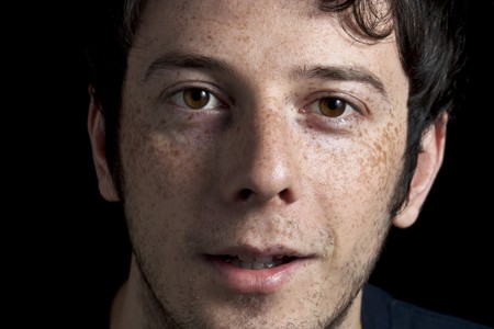 Intimate close-up portrait of young man with freckles and brown eyes showing detailed facial features and natural skin texture in warm dramatic lighting.