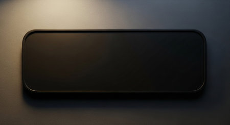 A dark, rectangular sign with rounded corners is centrally placed against a subtly textured gray wall, illuminated by a warm light source from the...