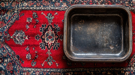 A vintage wooden tray rests on an exquisite Persian rug, showcasing intricate patterns in rich red tones. This charming arrangement adds warmth and elegance to any space.
