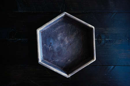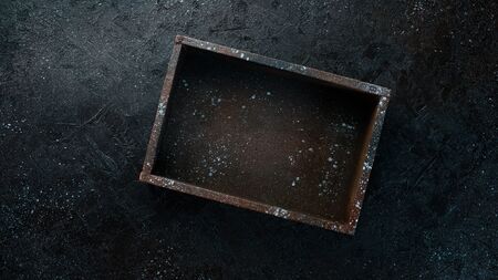 Old wooden black box. On a black stone background. Top view. Free copy space.