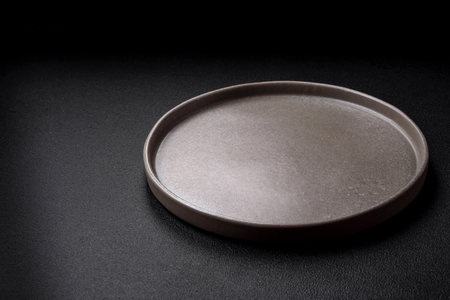 Empty ceramic plate on a dark textured background. Preparing kitchen utensils for a family dinner