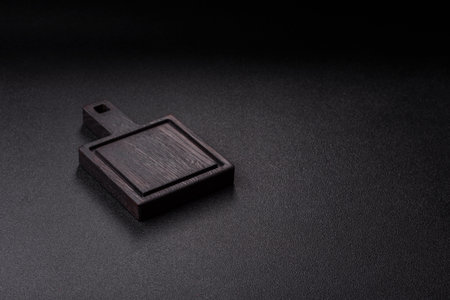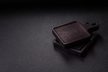 Wooden empty cutting board on a dark table. Wooden cutting board as a food background for your design