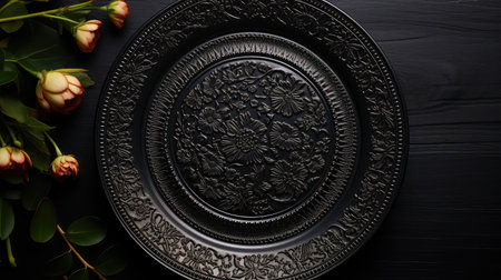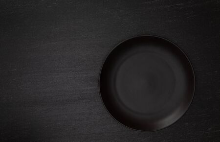 Empty blank black ceramic round plate or dish on black stone blackground with copy space, Top view of traditional handcrafted kitchenware concept
