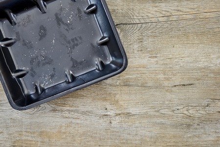 Empty rustic wood tray, healthy cooking background. Black background. top view. copyspace.