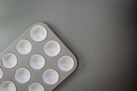 Baking tray with non-stick coating and baking paper on black background. top view.