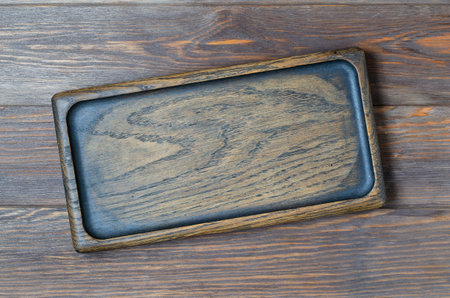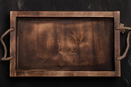 wooden tray. Wooden tray, plate, cutting board on dark stone concrete background, top view.
