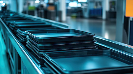 A row of empty x-ray trays stacked beside a conveyor belt in an airport security area