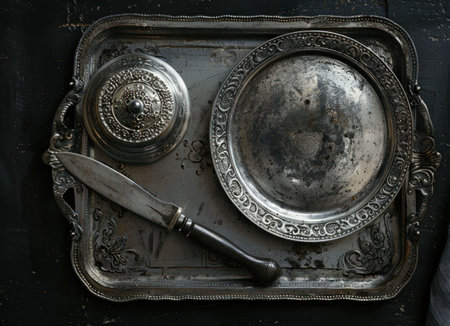 Vintage silver platter with ornate details, including a covered dish and a knife, set against a dark background